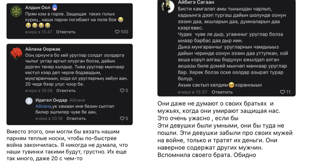 Он также возмутился, что ни Совет отцов и мужчины Тувы, ни правительство республики не отреагировали «на это позорное мероприятие». В комментариях жители Тувы тоже начали оскорблять девушек и обвинять их в том, что они «виляют попой», пока «парни мучаются на СВО».